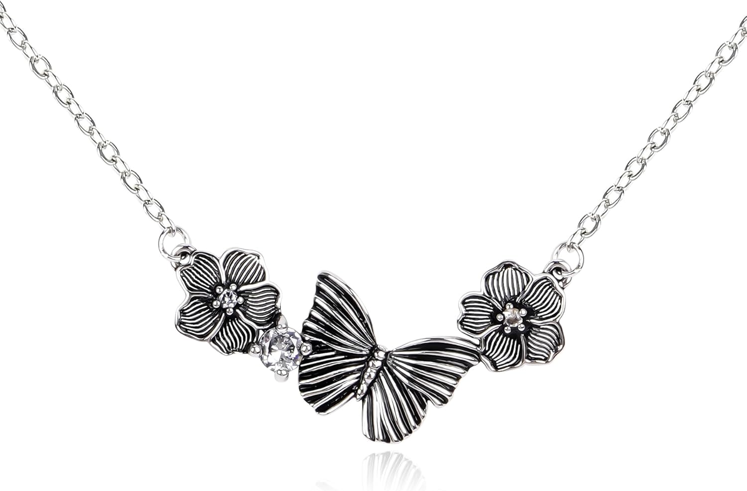 Vintage Silver Butterfly Necklace for Women 14K White Gold Plated Flower Butterfly Pendant Necklace Punk Retro Textured Butterfly Charm Choker Necklace Adjustable Insect Trendy Jewelry Gift for Women