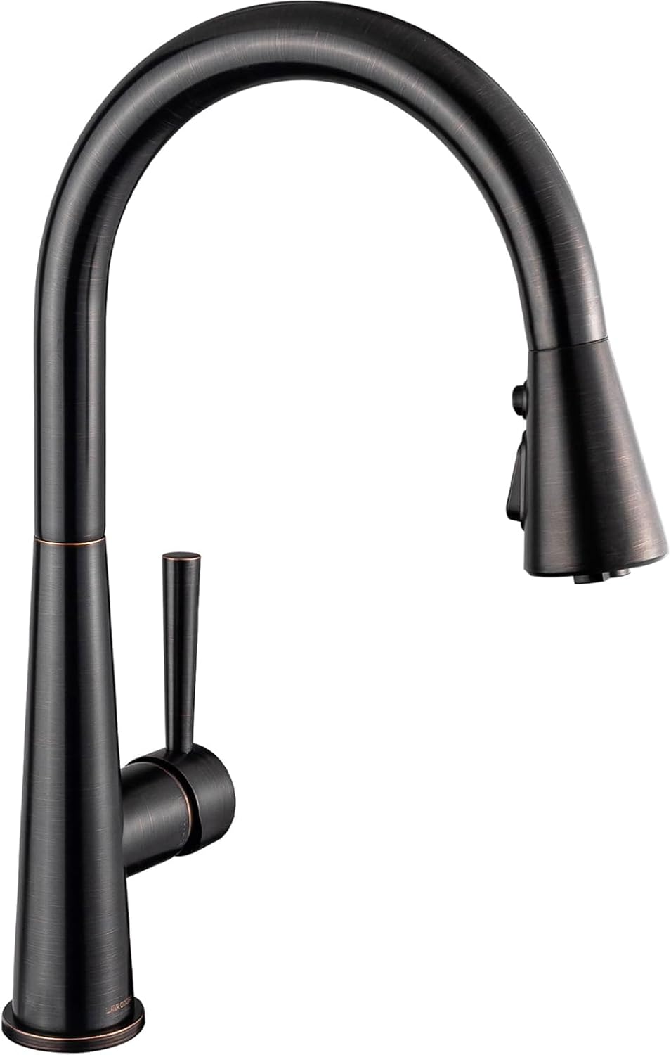 - LAST 3X LONGER - Crafted from corrosion-resistant brass material, the bronze kitchen faucet can last triple as long as stainless steel faucet. Enhanced by Reach Technology, the easy-retract hose and coordinating finish swivel adapter provide unparalleled flexibility to flex, pivot, and reach around the sink.