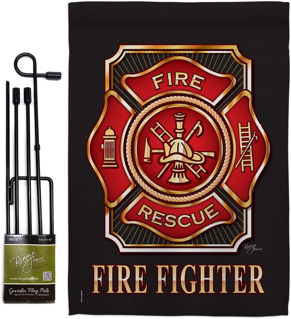 Fire Fighter Garden Flag - Set with Stand Armed Forces Firefrighter Fireman Department Rescue Red Line Hero Support - House Decoration Banner Yard Gift Double-Sided Made in USA 13 X 18.5