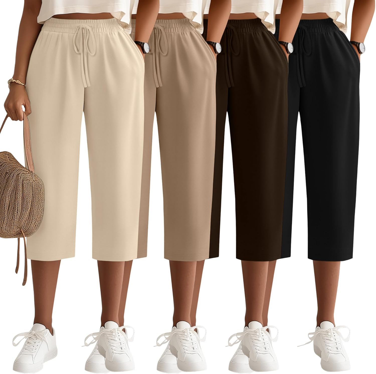 Neer 4 Pack Women's Capri Pants Wide Leg Yoga Capri Sweatpants Drawstring Summer Lounge Loose Fit Cropped Pants with Pockets