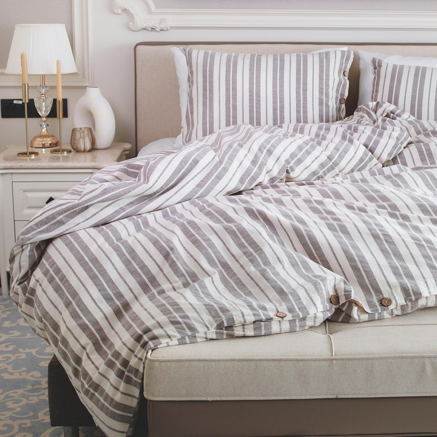 Lavien Home, 100% Natural Cotton Duvet Cover Set King Size, Linen Like Striped, 1 Duvet Cover with 2 Pillowcases, Soft and Easy Care (Milas, King 104"x90")