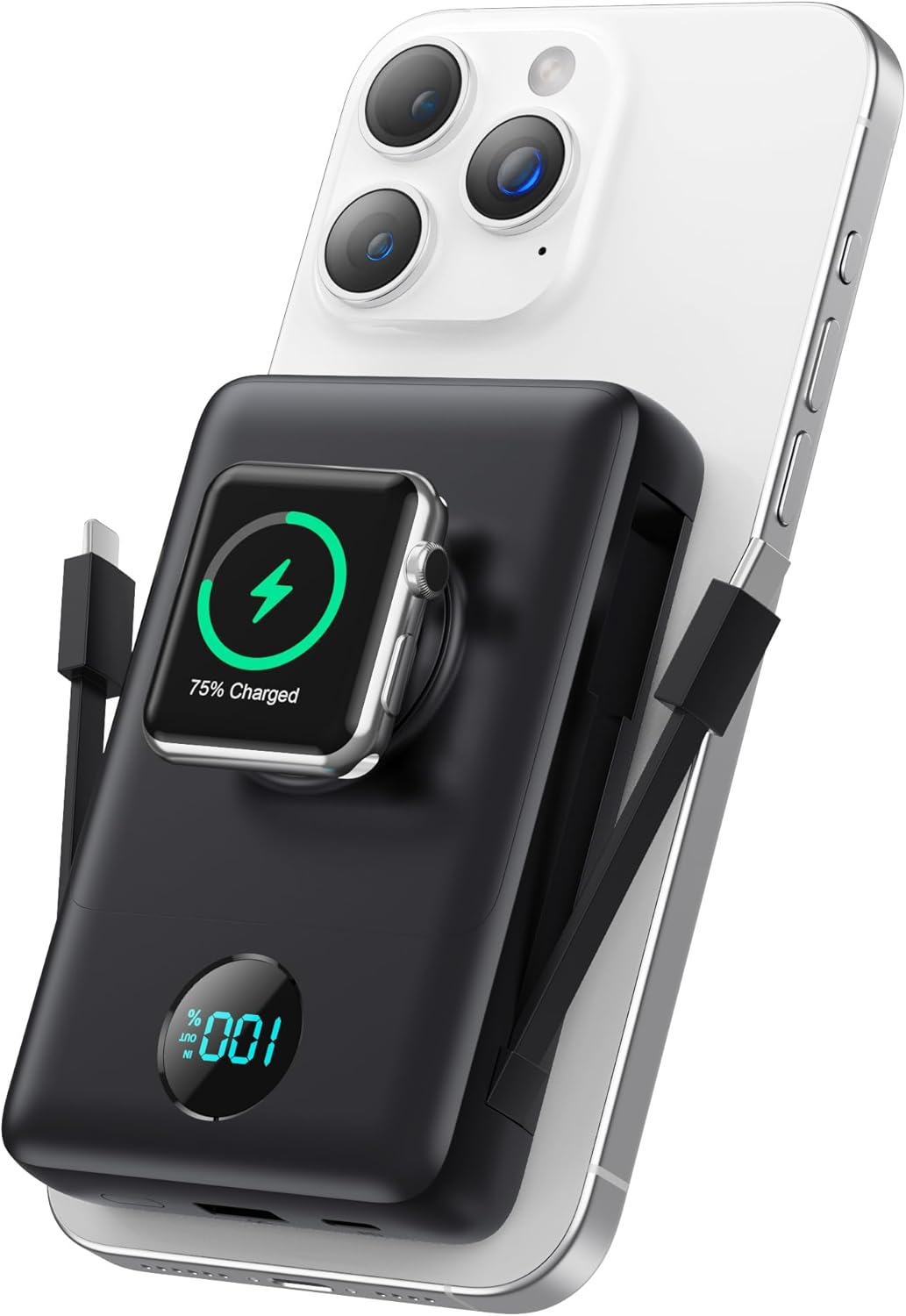 - Double-Sided Magnetic Portable Charger for iPhone 17/17 Pro/17 Pro Max/17 Air/iPhone 16/15/14/13/12 series and Apple Watch. Just align and charge—no cords needed.(Tips: Works with MagSafe case or no case for wireless charging).