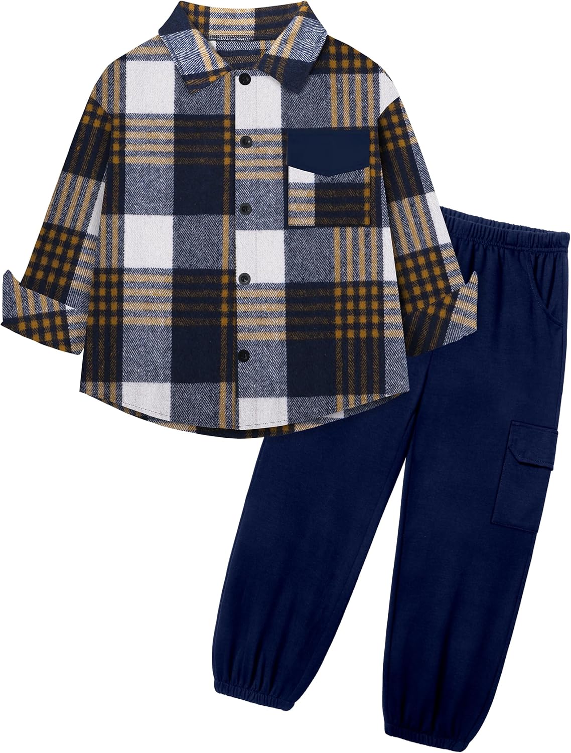 Toddler Boys Clothes Long Sleeve Flannel Plaid Button Shirt +Cargo Pants 2 Pcs Fall Winter Kids Outfits Set for 3-8T
