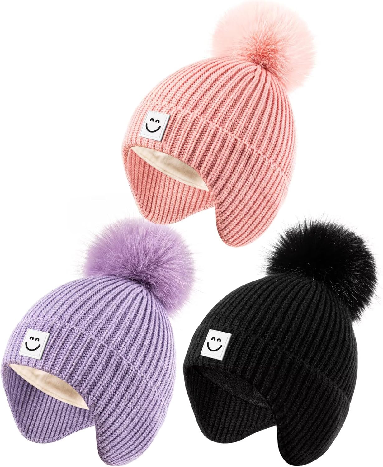 Alepo 3 Pack Baby Winter Hats with Earflaps, 2 Size Kids Pompom Beanie for Toddler Children, Smiley Face Hat for Girls Boys