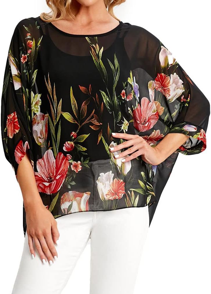 Rokou Women's Floral Blouse Loose Batwing Sleeve Beach Chiffon Poncho Sheer Tunic Tops