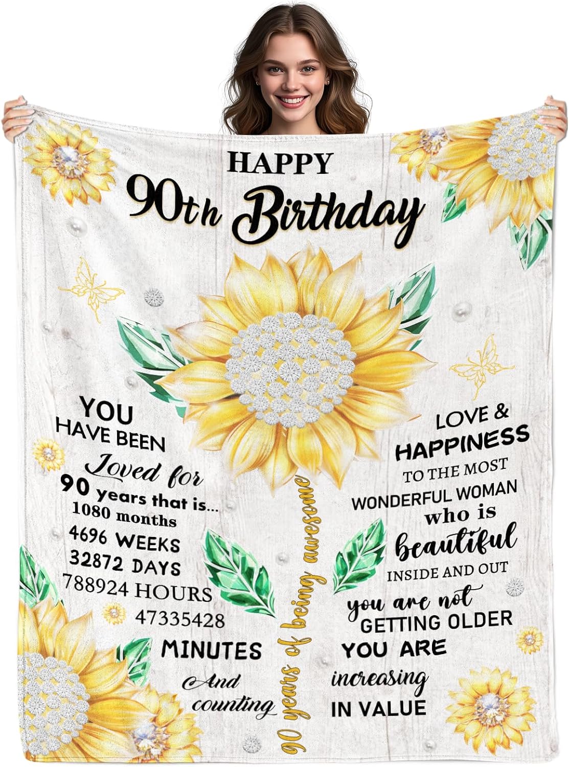 - 90th Birthday Century of Love Keepsake:Celebrate the remarkable 90th birthday with a blanket that’s a profound tribute to nearly a century of life’s journey. Emblazoned with heartfelt messages, it’s a precious heirloom for grandmas, great-grandmas, or beloved elders, wrapping them in warmth while honoring the countless memories, love
