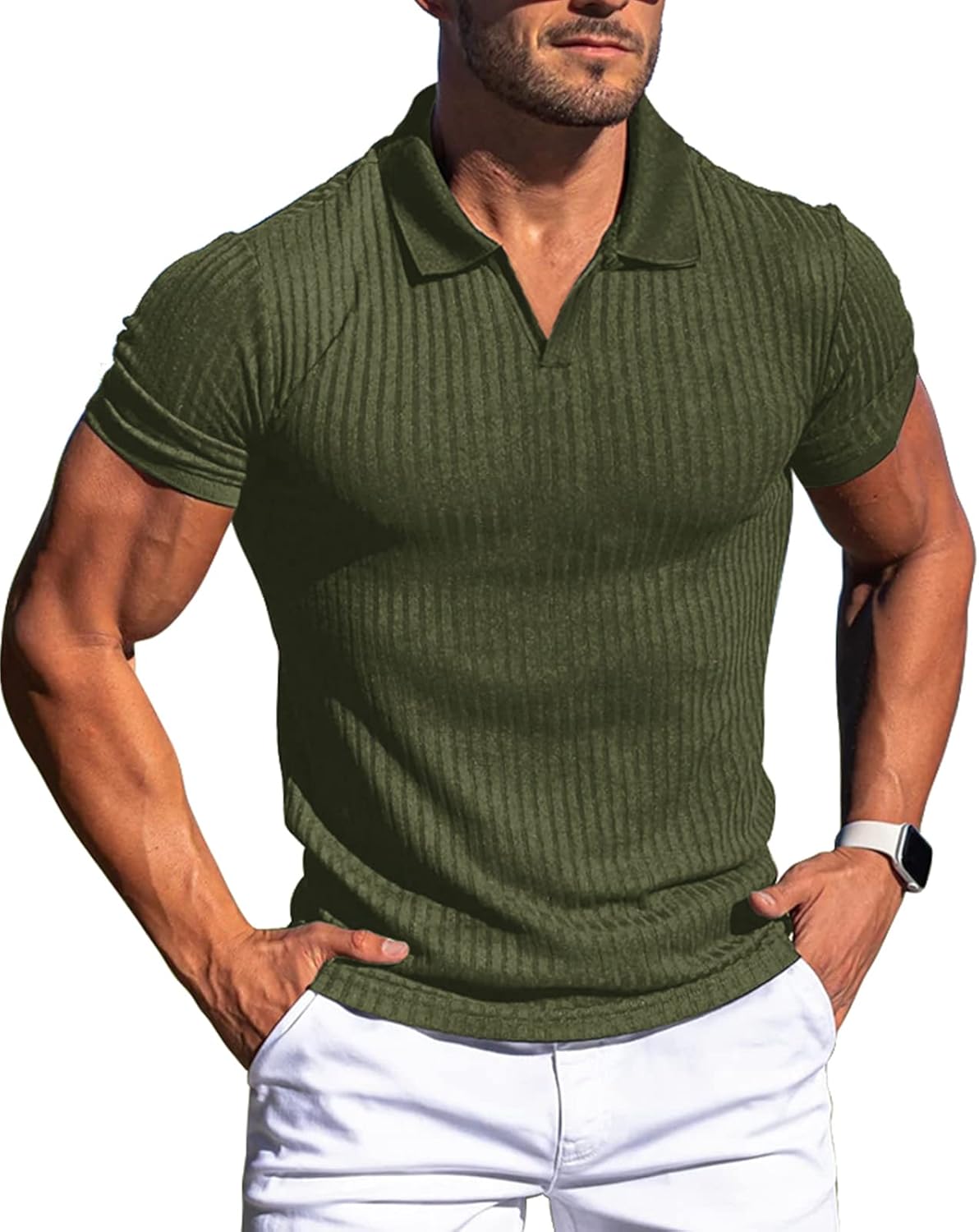 Collared Muscle Shirts for Men Ribbed Knit Slim Fit Polo Shirts Short Sleeve, Mens V Neck T Shirts Casual Stylish