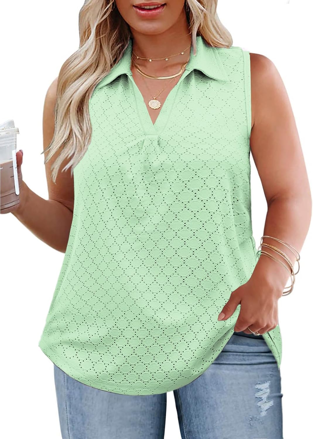 ROSRISS Womens Plus-Size-Tank-Tops Summer Sleeveless Casual Shirts Lapel V Neck Tunics Eyelet Tees