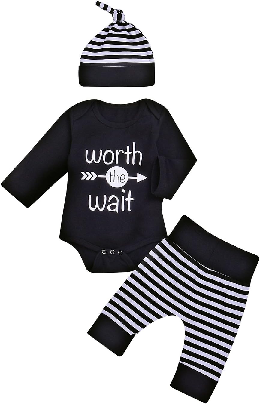 Baby Unisex Worth The Wait Arrow Printed Romper Striped Pant Hat Outfit Clothes