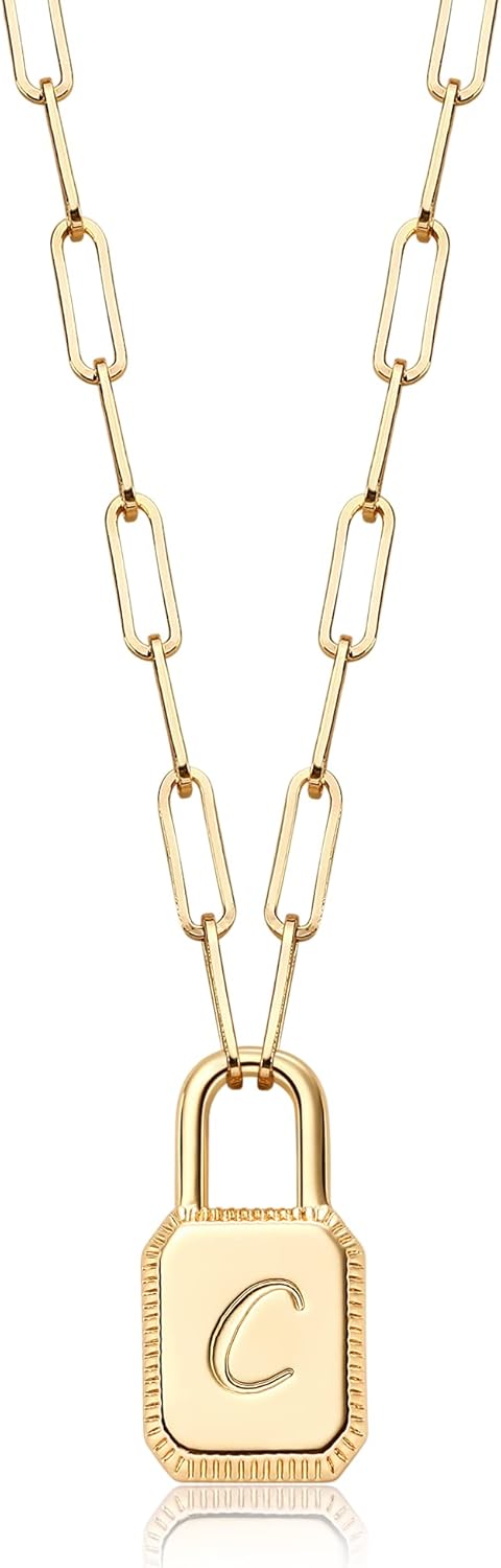 MTMY Lock Initial Necklace 14K Gold Plated Adjustable Paperclip Chain Dainty Lock Pendant Necklace Personalized Engraved Letter Jewelry for Women