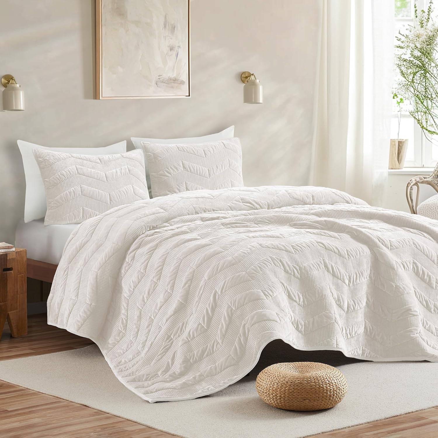SHALALA Velvet Quilt Set Queen Size,Ultra Soft Luxury Lightweight Summer Velvet Comforter Set, Oversized Bedspread Coverlet with 2 Shams Geometries Pattern,for All Season(Ivory,Full)