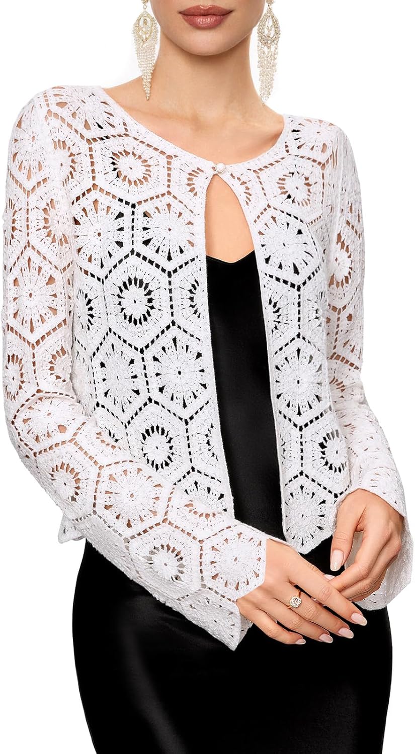 FAIRY SEASON Women's One-Button Crochet Cardigan with Golden Thread, Vintage Cropped Hollow Out Knit Shrug for Formal Events