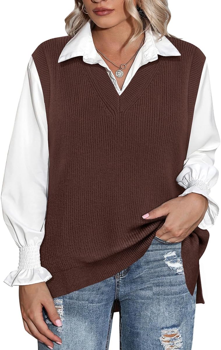CARCOS Plus Size Sweater Vest for Women V Neck Sleeveless Sweaters Knit Solid Brown Casual Preppy Style Pullover Tops JK Uniform Vest Tank Tops XL 14W 16W