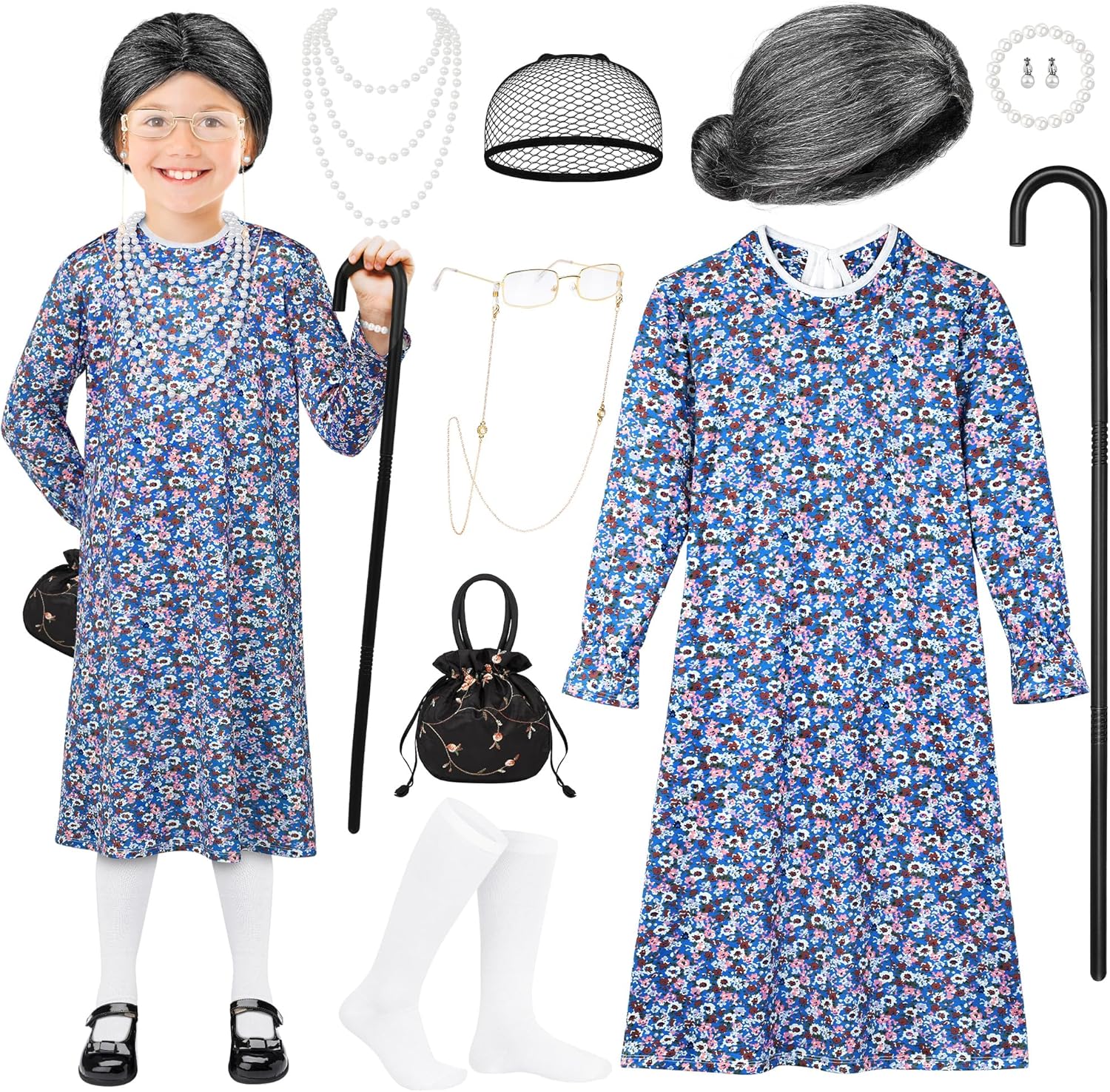 AOTHSO 10 Pcs Kids Old Lady Costume 100 Days of School Costume for Girls Halloween Grandma Dress with Wig Granny Cane for Kid