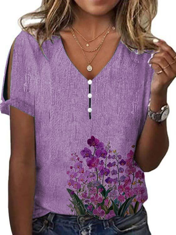 Women's 2024 Boho Casual Tops Floral Printed V Neck Loose Short Sleeve Shirts Summer Tunic Blouse Shirt Top
