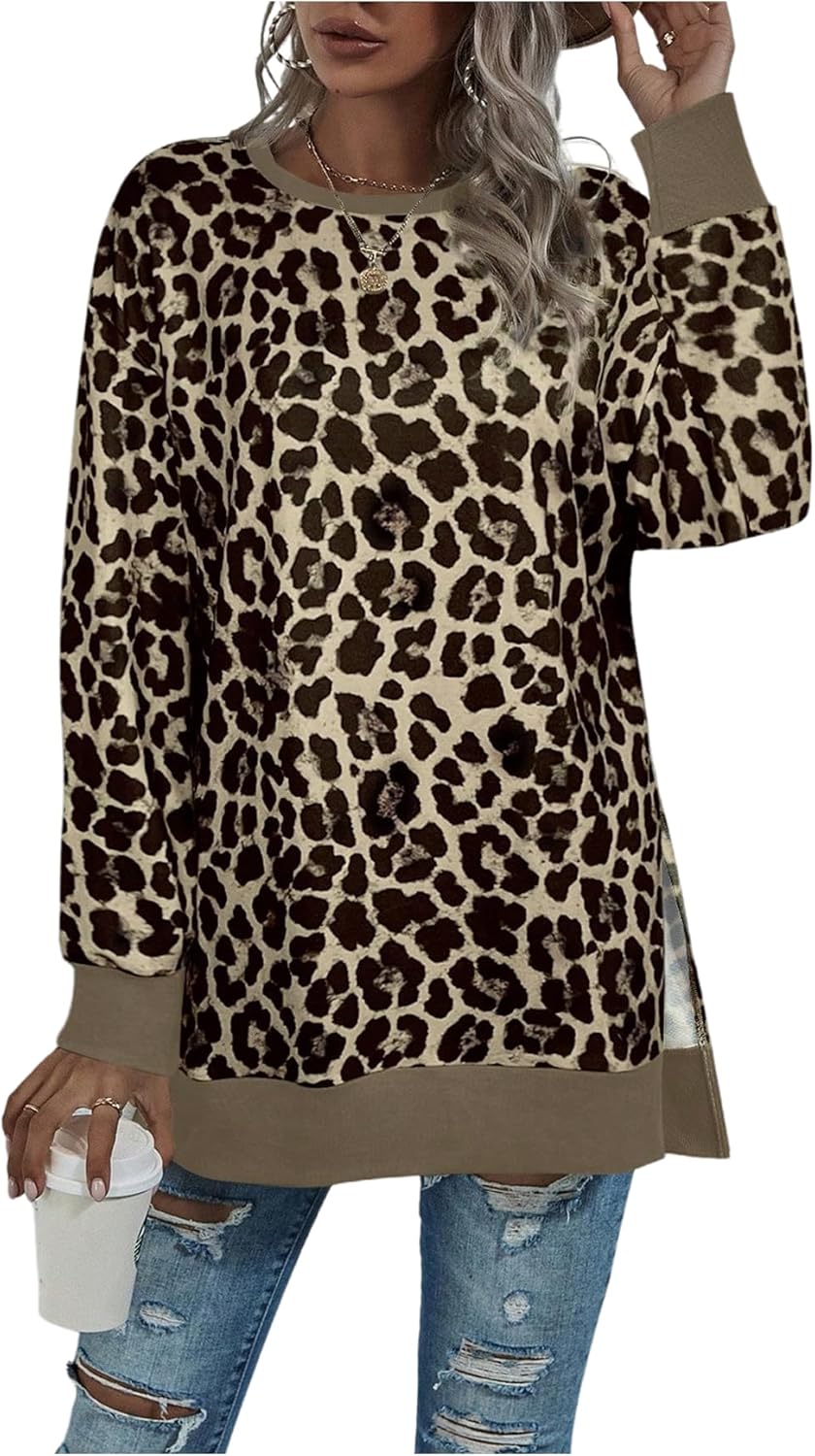 Milumia Women's Leopard Print Sweatshirt Long Sleeve Side Slit Pullover Tops