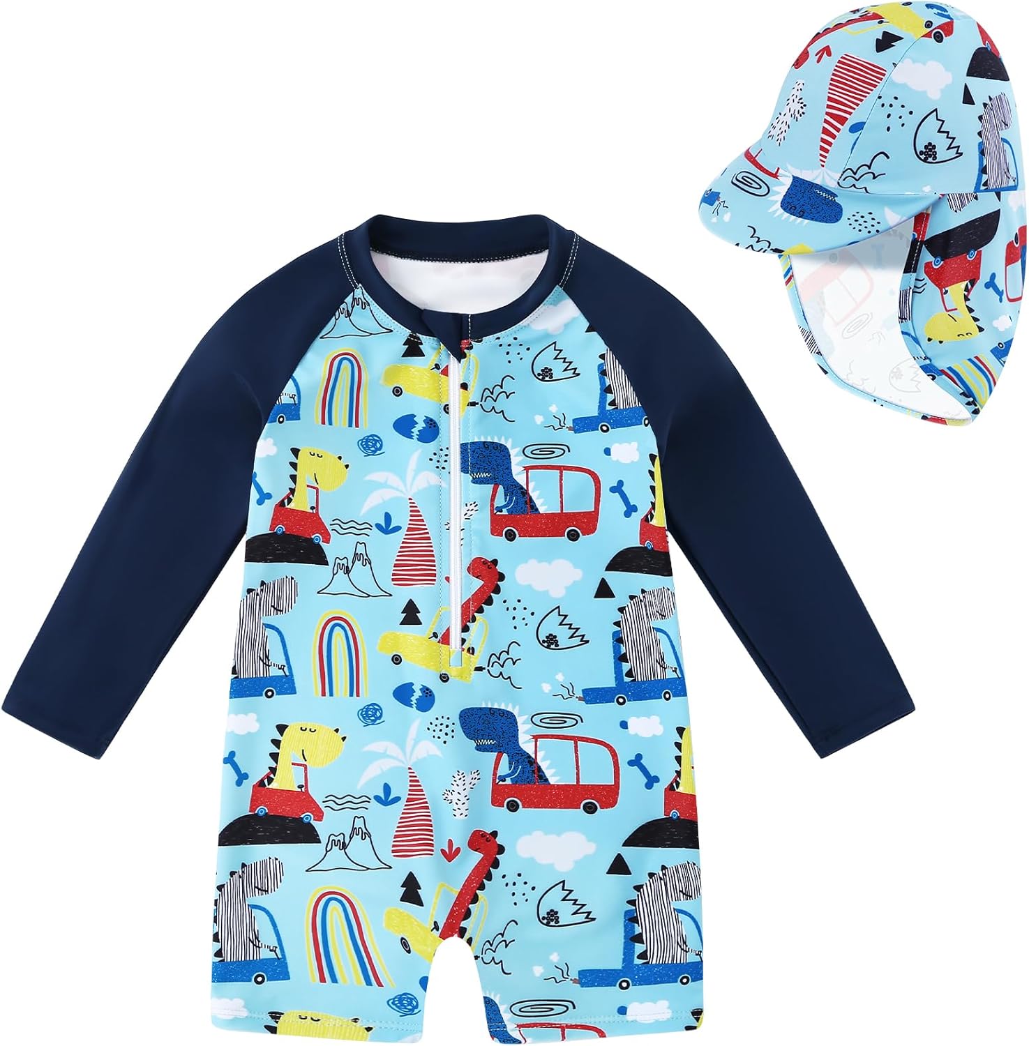 Baby Boy Swimsuit One Piece Long Sleeve Bathing Suit Rash Guard UPF 50+ Sun Protection with Hat 0-24 Months