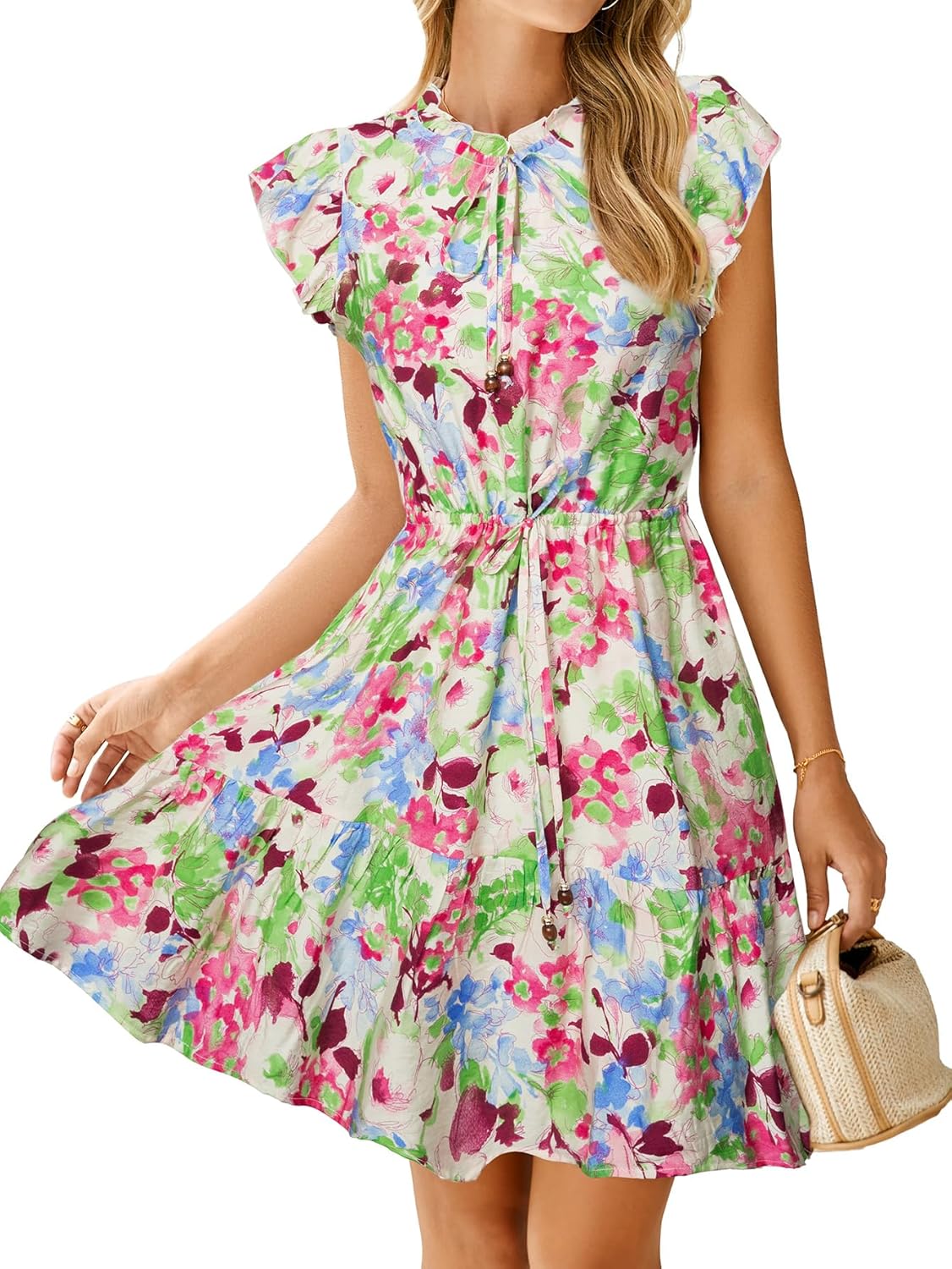 Simplee Womens Summer Dress 2026 Ruffle Short Sleeve Floral Boho Dress V Neck A-line Drawstring Mini Dress with Pockets