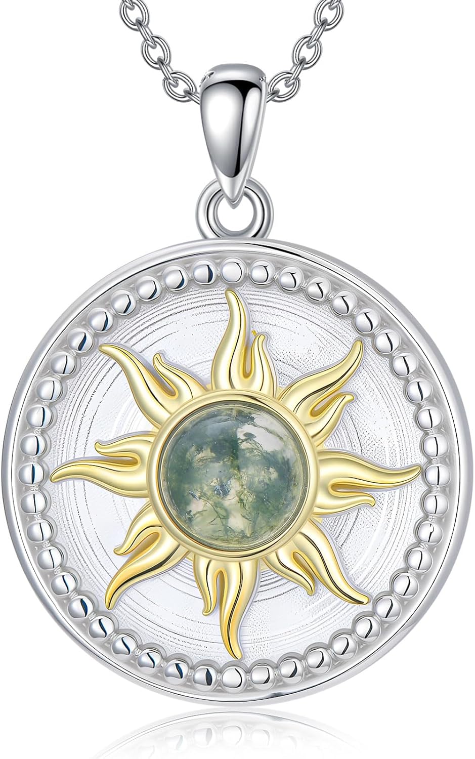 925 Sterling Silver Moss Agate Sunburst Pendant Necklace For Women, Natural Round Cut Green Moss Agate, Dainty Birthday Jewelry Gifts For Her