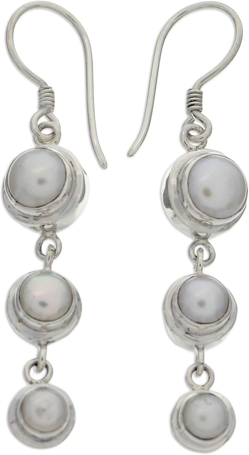 NOVICA Artisan Handmade Cultured Freshwater Pearl Dangle Earrings .925 Sterling Silver White Indonesia Bridal Birthstone 'Three Full Moons'