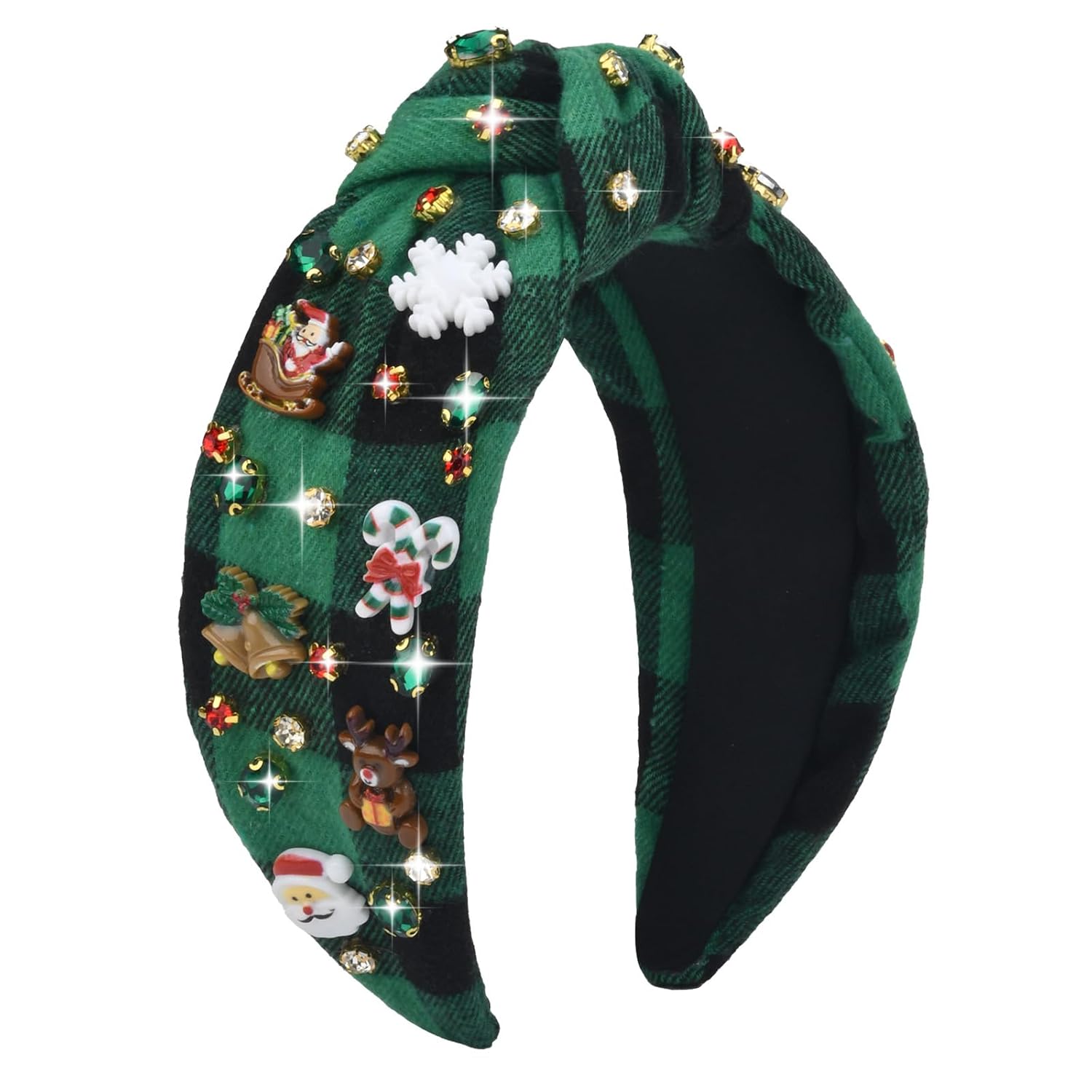 Christmas Headbands for Women - Rhinestone Knotted, Jeweled Santa, Crystal Snowflake, Plaid Holiday Hair Accessories Gifts (Black Green Plaid)