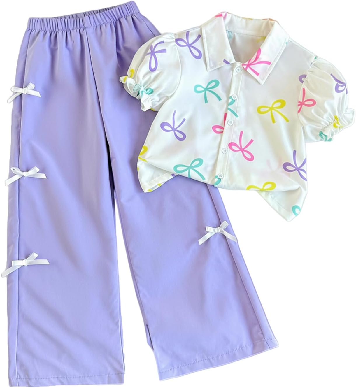 WDIRARA Girl's 2 Piece Outfit Colorful Bow Puff Sleeve Button Up Shirts Wide Leg Pants Set Cute Outfits