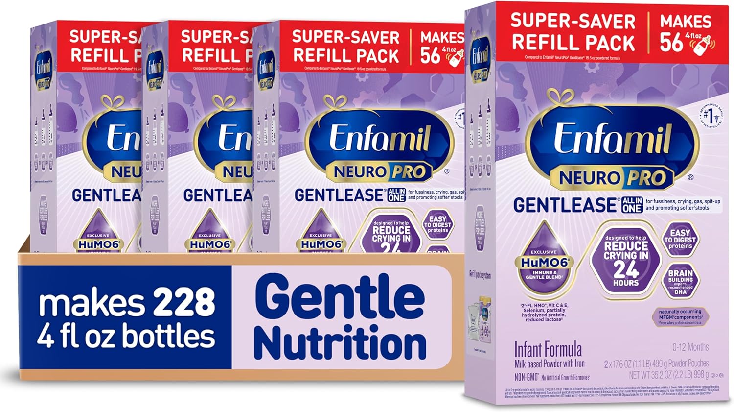 - DESIGNED FOR ALL-IN-ONE DIGESTIVE COMFORT IN 24 HOURS Enfamil NeuroPro Gentlease is a baby formula designed to ease or reduce fussiness, crying, gas, and spit-up in just 24 hours