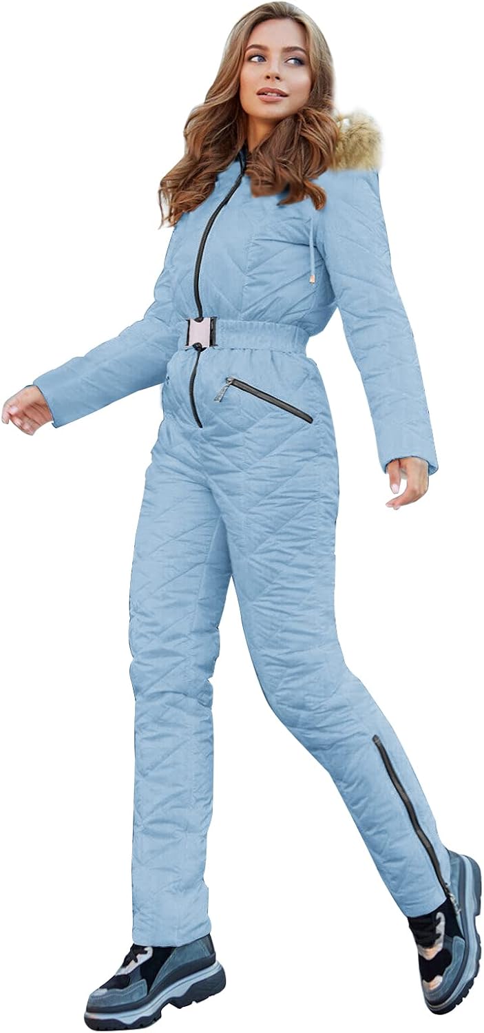 Yousify Womens Winter Ski Suit One Piece Hooded Fur Collar Ski Jumpsuit Snowsuit Outdoor Sports Coat