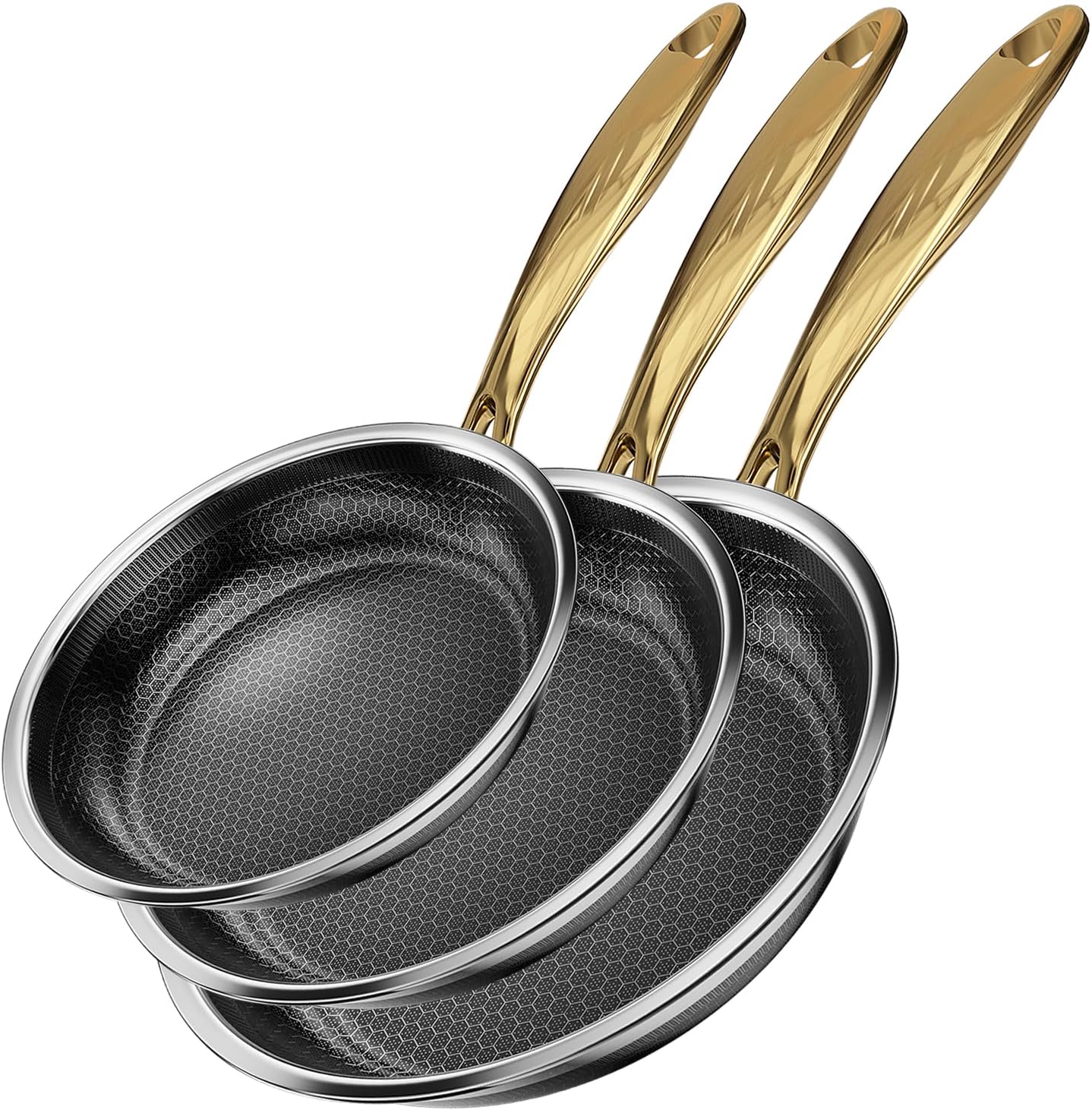 FogDream 3 Pcs Non Stick Frying Pans without Lids, 8, 10 & 12 Inch Stainless Steel Skillets, Tri-Ply Stainless Steel for All Cooktops, Dishwasher & Oven-Safe Cooking Pan, Stay-Cool Handle, Gold