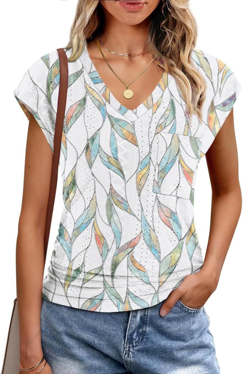 Eyelet Womens Tops Cap Sleeve V Neck T Shirts for Women Summer Shirts
