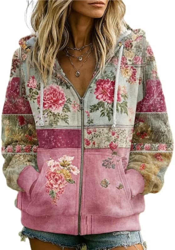 OSCORP Women's Floral Patchwork Zip-Up Hoodie – Vintage Boho Print Sweatshirt for Casual Fall Outfits