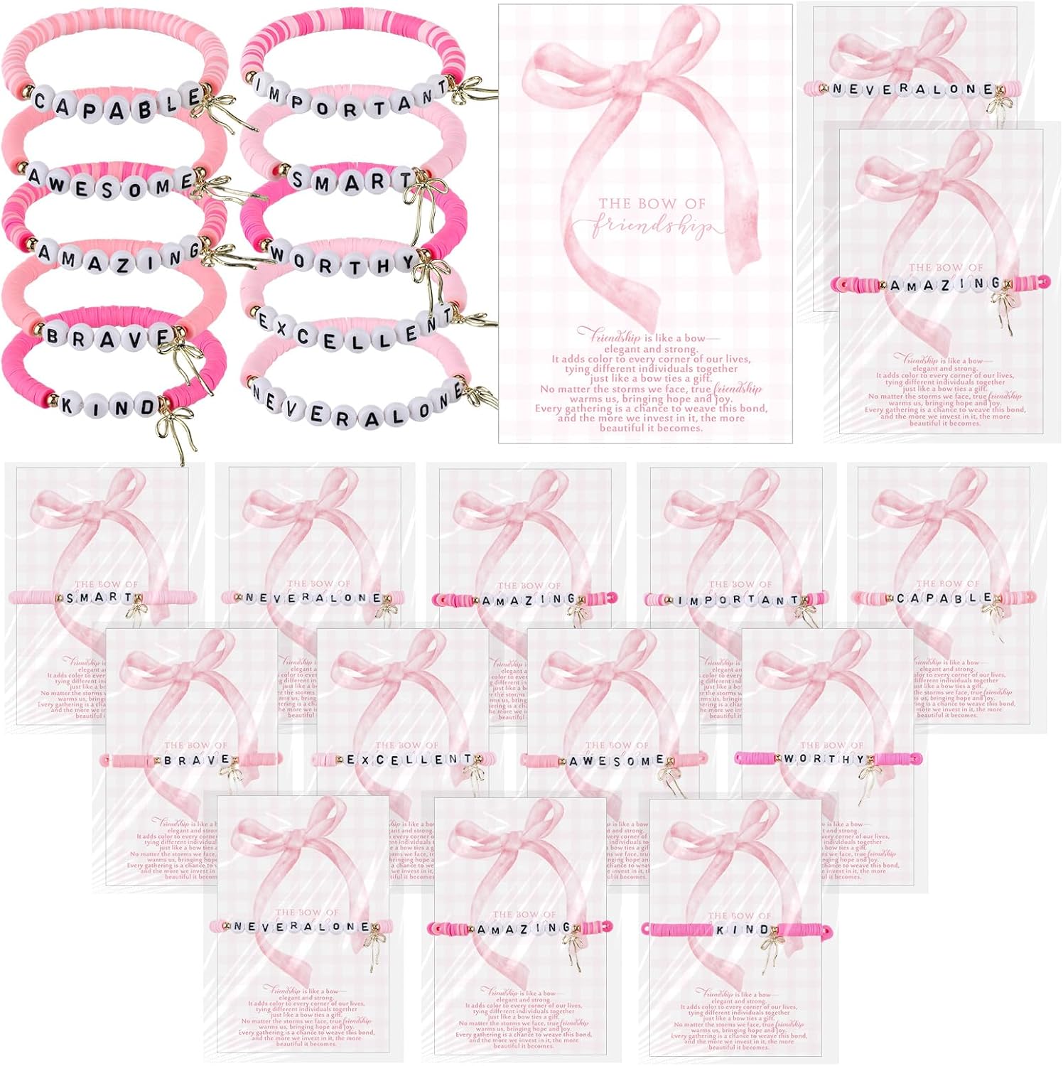- Friendship Bracelets:featuring soft pink bow bracelets paired with matching cards, this set brings warmth and charm to friendship celebrations; The cheerful tones make these pink bow bracelets eye catching party favors and sweet gifts for friends