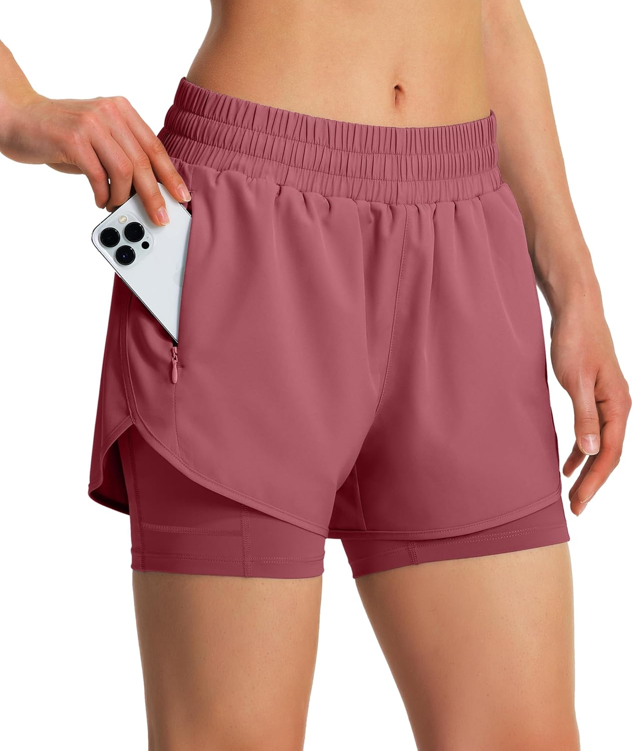 Ksmien Women's 2 in 1 Running Shorts Quick Dry Athletic Gym Workout Shorts with Liner Phone Pockets