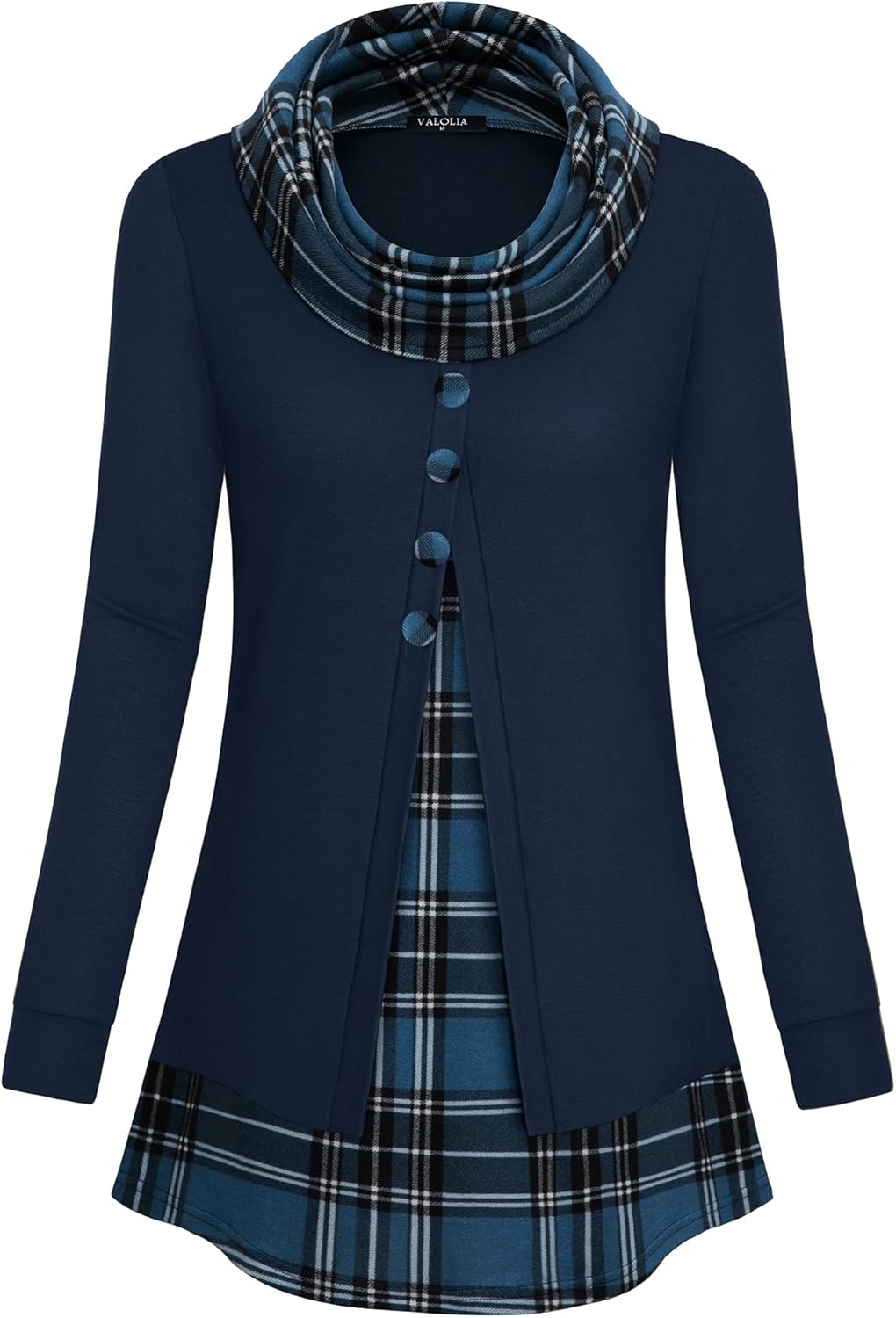 VALOLIA Womens Cowl Neck Long Sleeve Tunic Tops Button Casual Loose Shirts