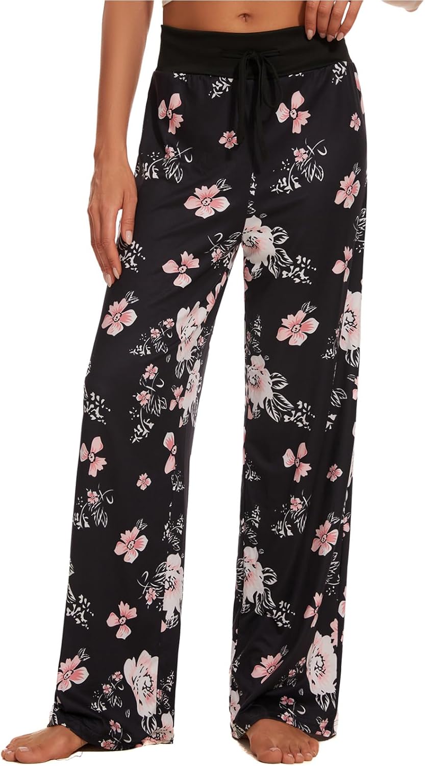ROSA JUNIO Comfy Pajama Pants for Women Casual Drawstring Floral Palazzo Lounge Pants Stretch Wide Leg Bottoms