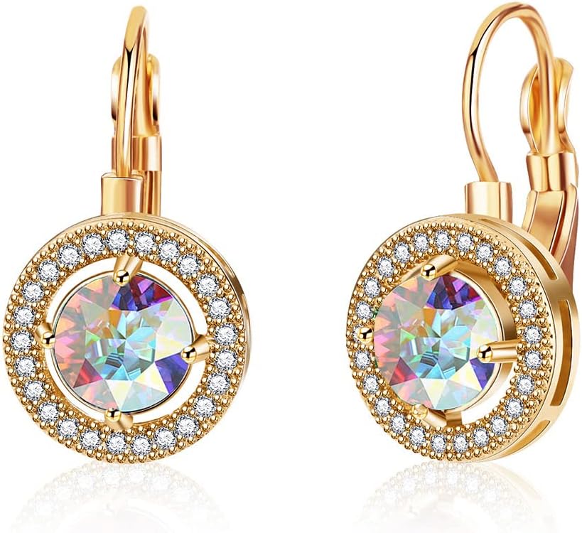 Austrian Crystal Halo Round Drop Leverback Earrings for Women 14K Rose Gold Plated Hypoallergenic Jewelry