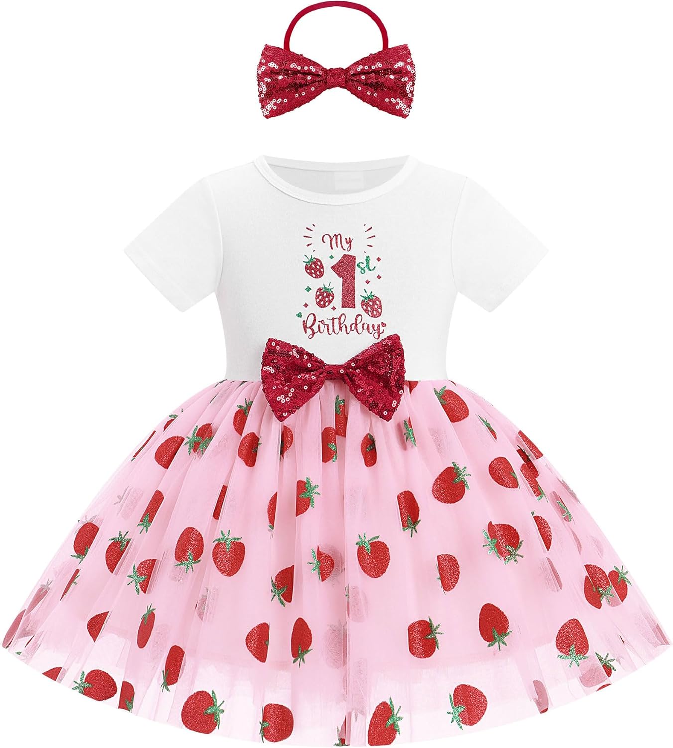 ODASDO Baby Girls Strawberry 1st 2nd 3rd Birthday Dress Cotton Short Sleeve Tulle Tutu Dresses with Bowknot Headband Set