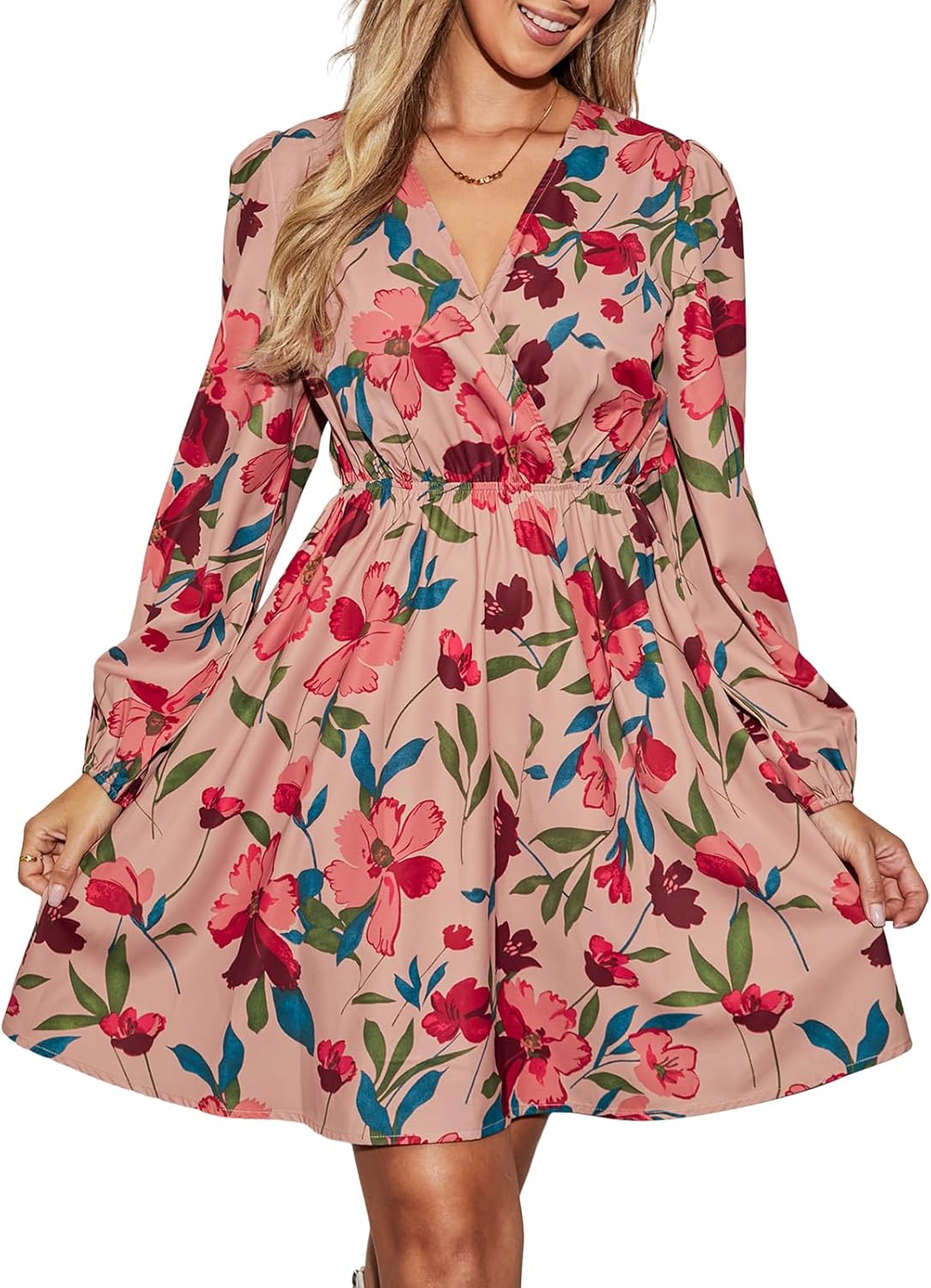 CUPSHE Women Floral Ruffle Summer Dress Surplice V Neck Long Peasant Sleeve Elastic Waist Flowy Casual Holiday Mini Dress