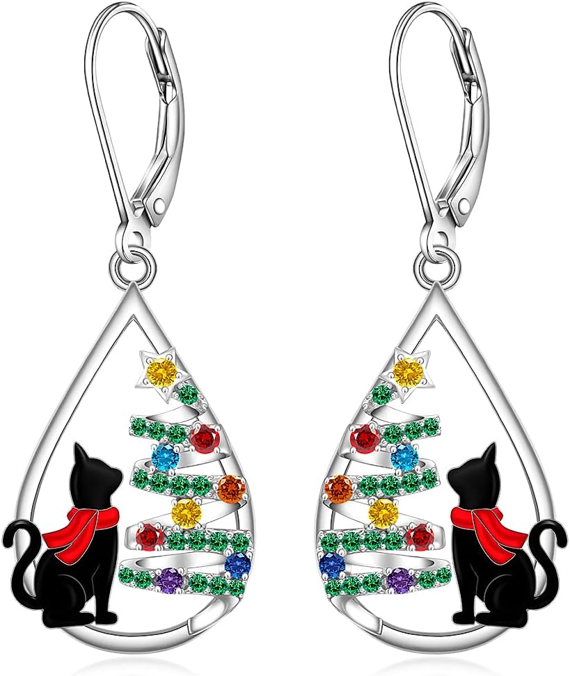 Black Cat Earrings Christmas Tree Earrings for Women Sterling Silver Dangle Cat Earring Holiday Leverback Halloween Christmas Cats Gifts