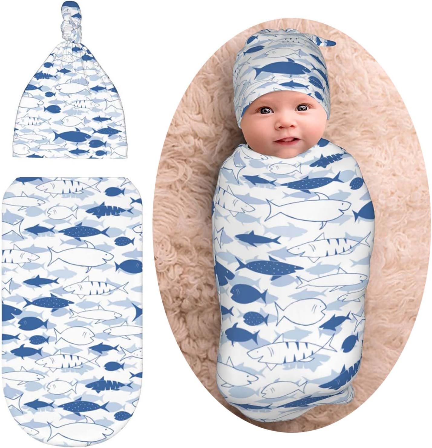 Sharks Ocean Beach Fish Funny Blue Newborn Swaddle Blanket Baby Stuff Baby Swaddling Blanket with Beanie Set Soft Sleeping Sack for Unisex Girls Boys