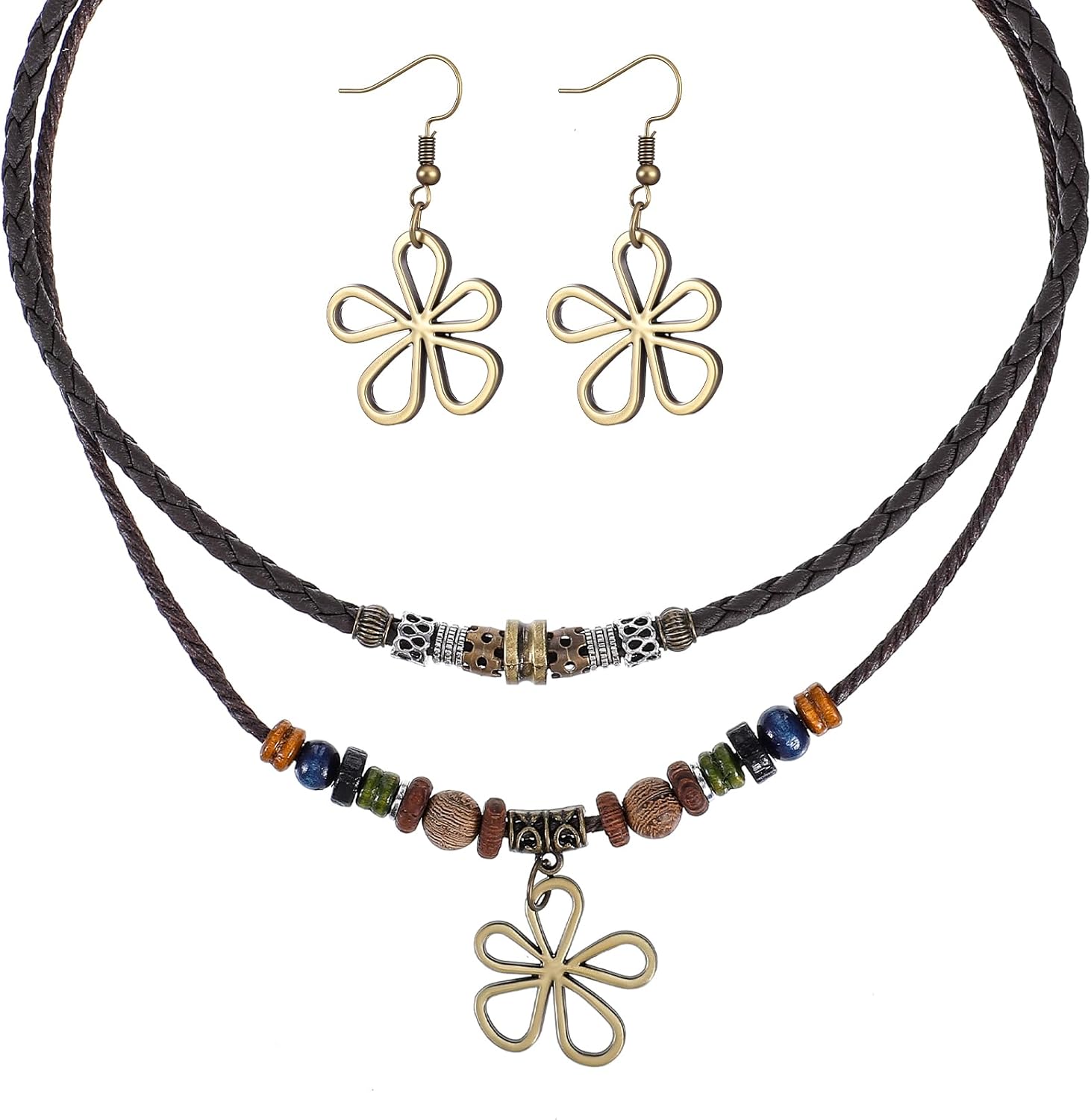 Multi-Layer Wood Bead Necklace with Hollow Flower Earrings, Bohemian Bead Charm Necklace Unisex Personality Hippie Long Jewelry for Men Women