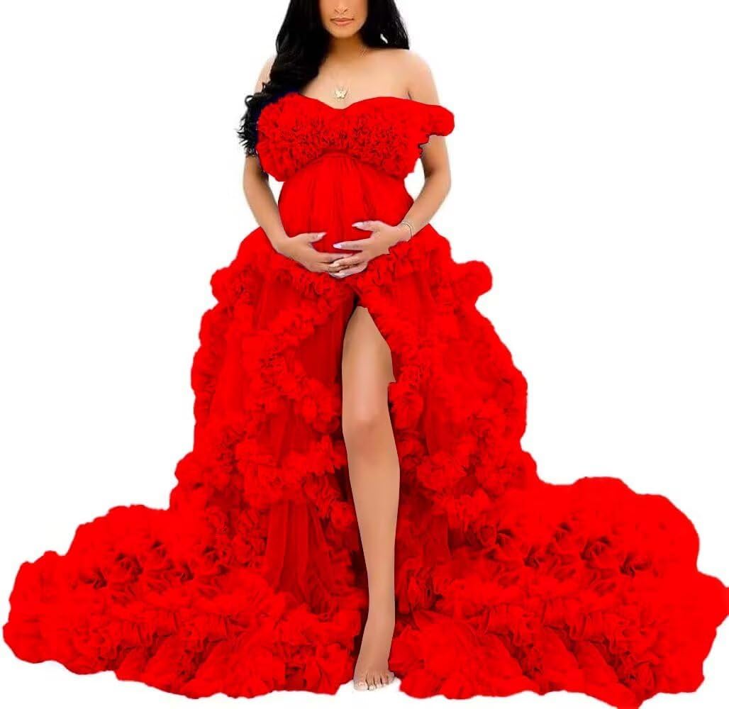 Off Shoulder Maternity Dresses Long Robe for Photoshoot Tulle Puffy Ruffles Pregnancy Gown for Baby Shower
