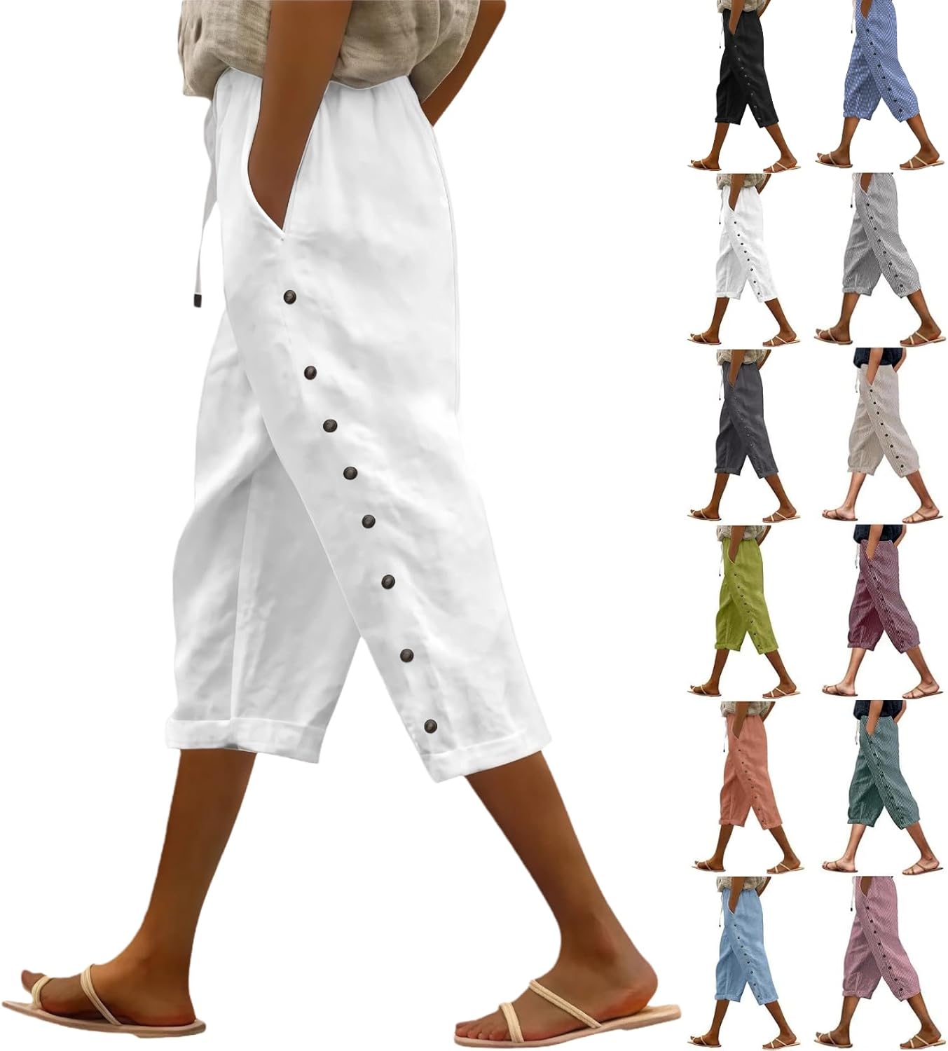 Linen Capri Pants Women Spring Summer Casual Beach Drawstring Side Button Elastic Waist Straight Wide Leg Cropped Pant