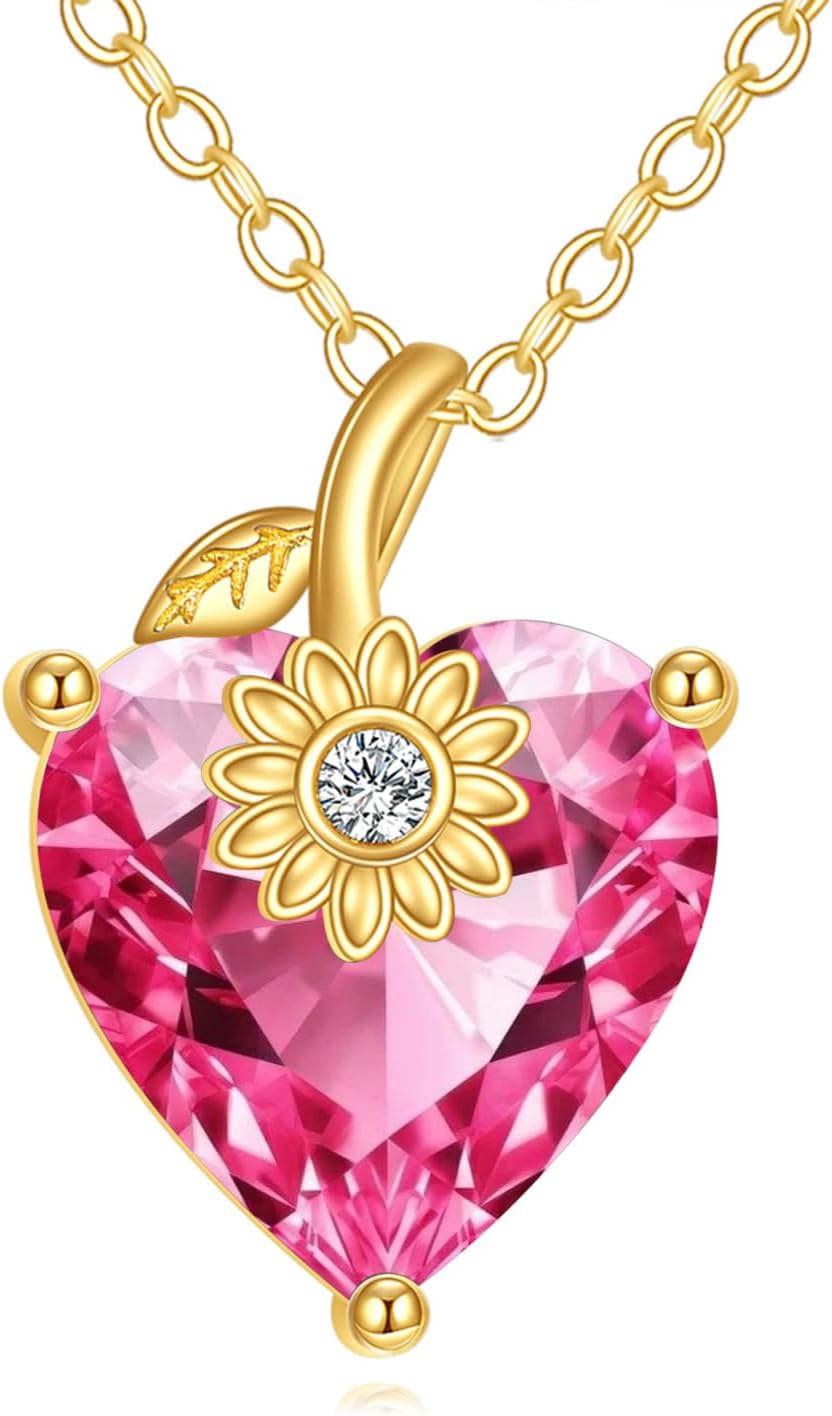 14K Solid Gold Heart Birthstone Necklace 3 Carat Created Gemstone Sunflower Pendant Necklaces Fine Jewelry Gifts for Women, Sterling Silver Chain 18"+2" Extender