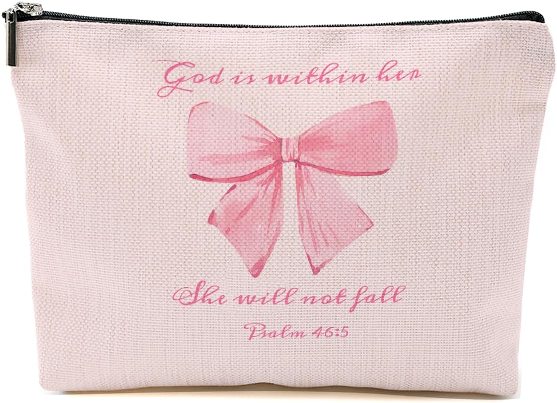 Coquette Pink Bow Makeup Bag for Women, Bible Verse Portable Travel Organizer Toiletry Pouch Cosmetic Bag with Zipper, Preppy Roomy Makeup Bags Travel Accessories, Christian Gifts 2