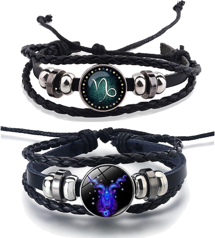 2Pcs Zodiac Bracelets Layered Leather Constellation Bracelet Vintage Zodiac Signs Spirit Bracelet Wrap for Women Men 12 Constellation Gift