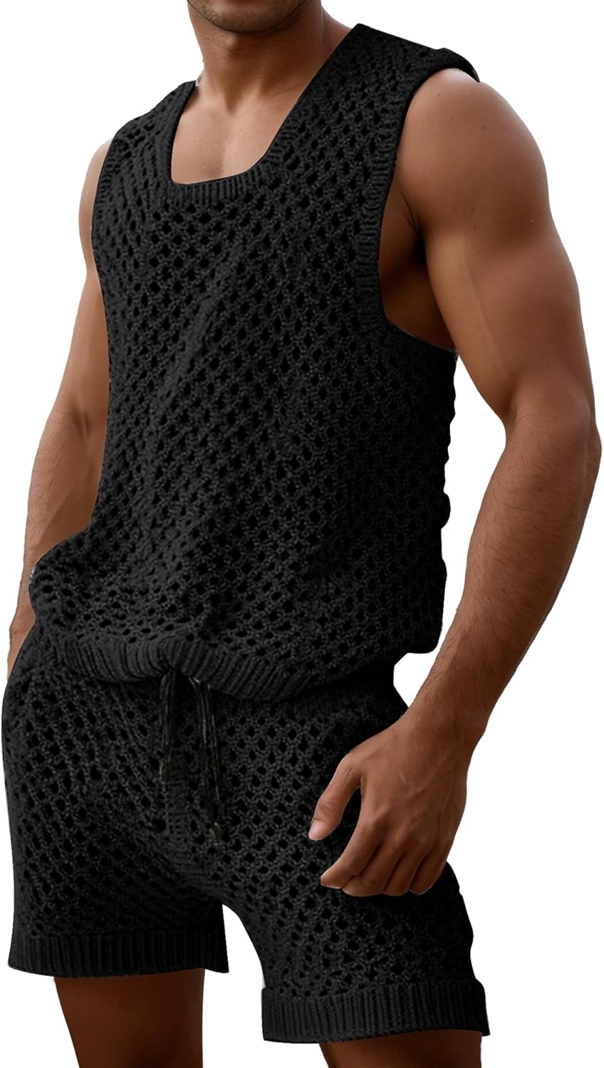 FEOYA Men Crochet 2 Piece Outfits Mesh Sheer Tank and Shorts Summer Fishnet Shorts Set for Beach Casual