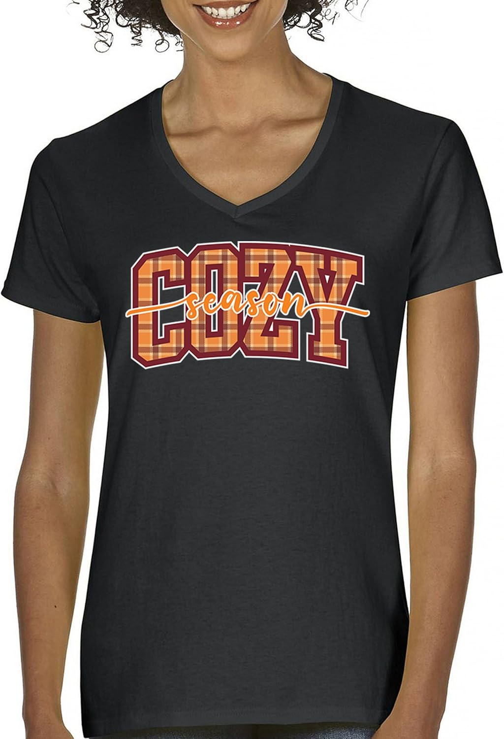 Cozy Season Women's V-Neck T-Shirt Fall Pumpkin Spice Corn Maze Cute Plaid Thanksgiving Autumn Family Dinner Turkey Day Tee