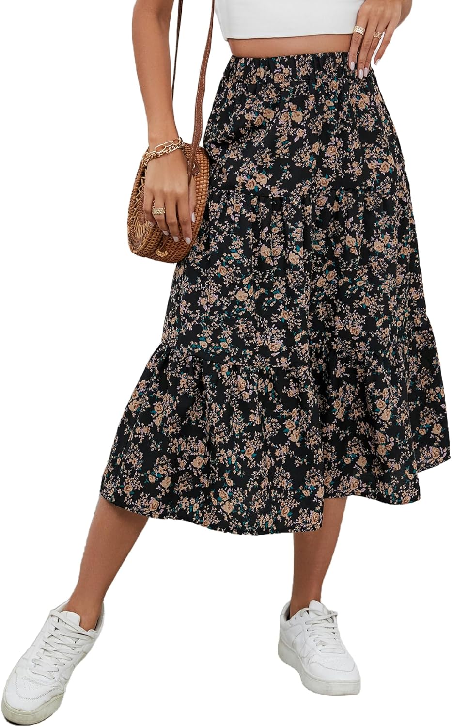Milumia Women's Floral Print Ruffle Hem A Line High Waist Flare Flowy Midi Skirts