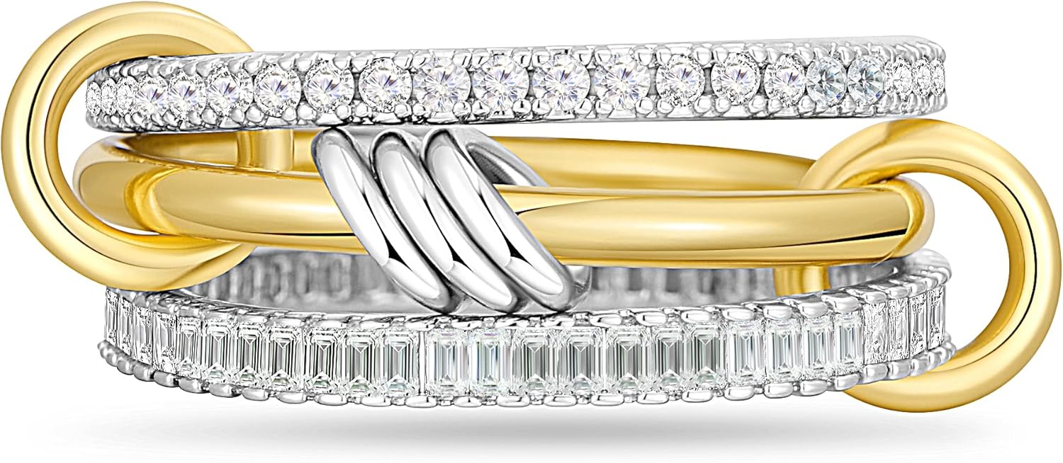 14K Gold Plated Stackable Rings,3 CZ Cubic Zirconia Ring Set,Silver & Gold Stacking Rings, Multi-Link Connected,Statement Interlocking Band for Women, Hypoallergenic, Non Tarnish wedding ring